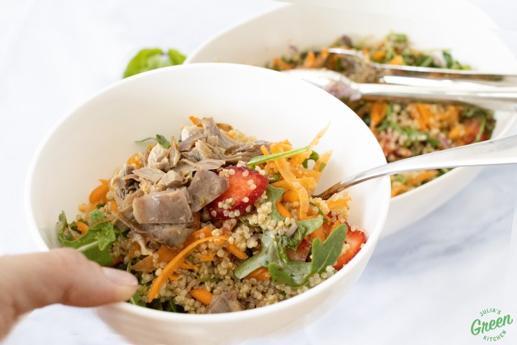 Keyword: arugula quinoa strawberry salad with citrus vinaigrette dressing, easy healthy lunch, easy main dish, kid approved, kids-friendly, main course salad, main dish salad, mint salad, salad for dessert, spring salad, strawberries in a salad, summer salad