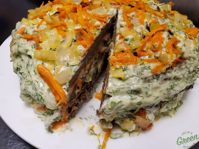 Using a long knife, make several slits in a liver patty. Spread mayo mix and sauteed vegetables evenly. Repeat with all the liver patties.