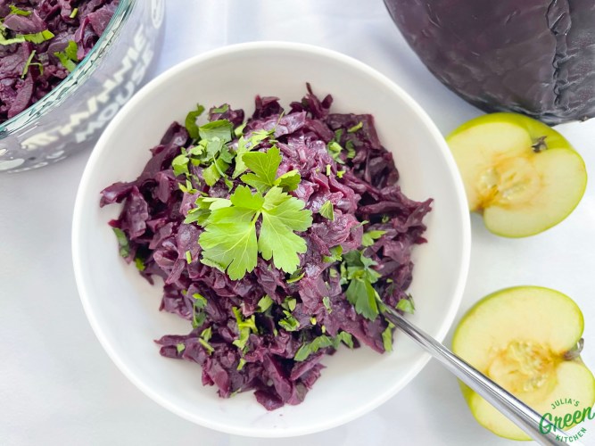 Keyword: cruciferous vegetables red cabbage with apples and apple cider vinegar, easy healthy side dish, german red cabbage, red cabbage side dish, red cabbage with apples, side dish for hearty dishes, sugar free red cabbage recipe