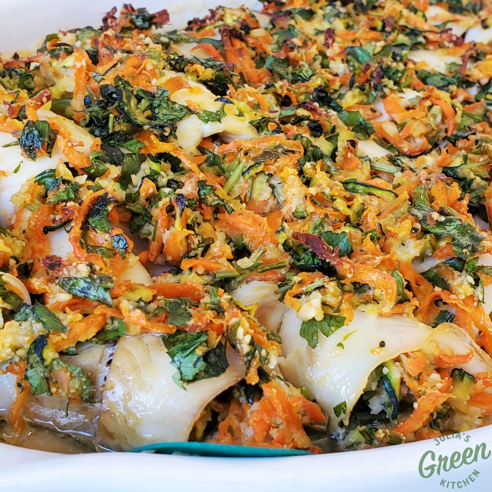I love cooking fish. Flounder, in particular, is extremely versatile and easy to work with, affordable, widely available and virtually impossible to ruin (except for drying it out by keeping in the oven for too long). This flatfish can be very flavorful and light, cooks quickly, and is loved by all members of the family from toddlers to grandparents . I always have a large bag of wild flounder fillets from Costco in my freezer.A lot of quick and easy flounder fillet recipes call for parmesan or bread crumbs crust to give it flavor but since we choose not to use either cheese or bread crumbs, I decided to use staples in my kitchen that are easy to find, easy on the budget and easy to cook- carrots and zucchinis, for this recipe. It came out excellent and I decided to keep and share it. If you own a shredding attachment for your food processor or standing mixer, it'll take even less prep time. Let's get rolling!